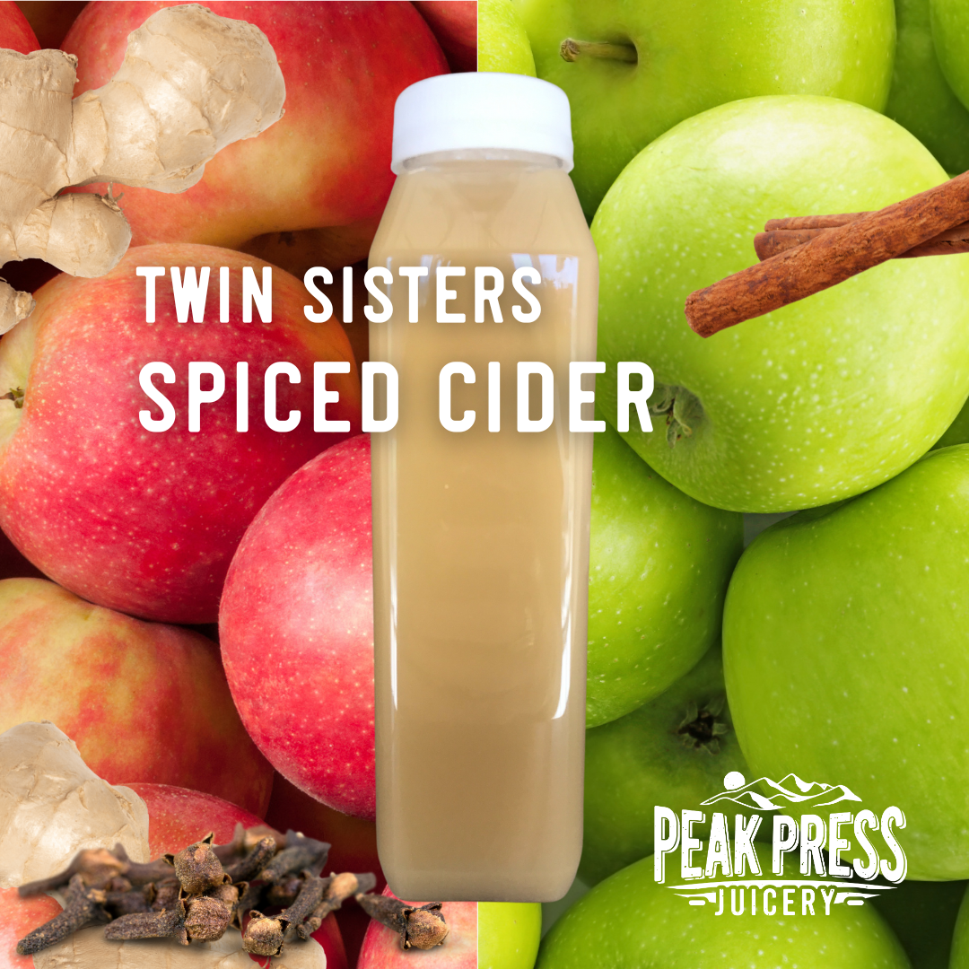 Named after our beautiful Twin Sisters Peaks, our cider combines sweet Gala and tart Granny Smith apples for a complex and memorable cider. The addition of ginger root and fresh spices delivers a cozy and warming cider experience. Like our other cold-pressed juices, our ciders are fresh, raw and unpasteurized, so you get all of the nutrition and flavor of fresh pressed apples.